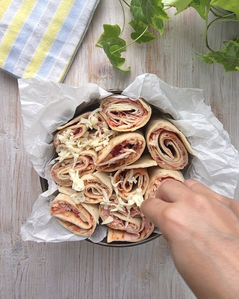 Toma un molde desmontable de 20 cm. Luego, humedece una hoja de papel de horno, exprímela y colócala dentro del molde. Después, coloca los rollitos, transfiere todos los rollitos sobre el molde y decora con más queso.