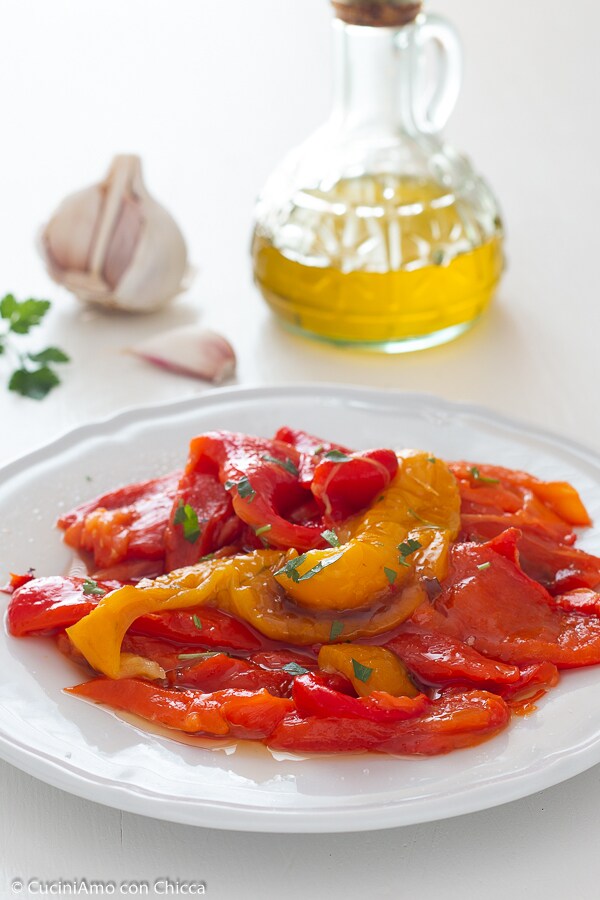 Son buenos tanto fríos como calientes, podéis usarlos también para rellenar bruschettas o para condimentar pasta. Para la receta podéis utilizar pimientos rojos, amarillos o verdes. Simplemente hay que lavarlos y colocarlos enteros en la bandeja, justo el tiempo para que se asen y luego se deben cerrar en una bolsa, para facilitar el pelado. Después simplemente hay que condimentarlos con aceite, sal, ajo y perejil.