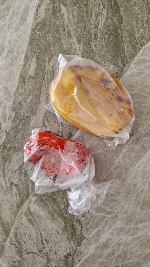 Tomad los pimientos asados y cerradlos bien uno por uno en bolsas de alimentos, dejadlos a temperatura ambiente durante unos 15 minutos, o hasta que se hayan enfriado, de esta manera, el vapor favorecerá el pelado.