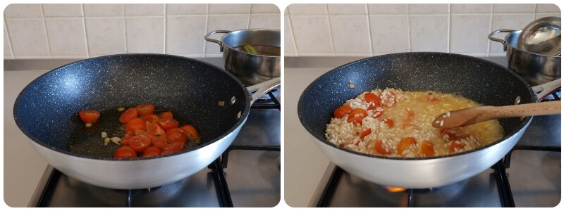 Añadid el arroz y tostadlo un par de minutos, continuad la cocción vertiendo un poco de caldo a la vez, llevará unos 12 minutos.