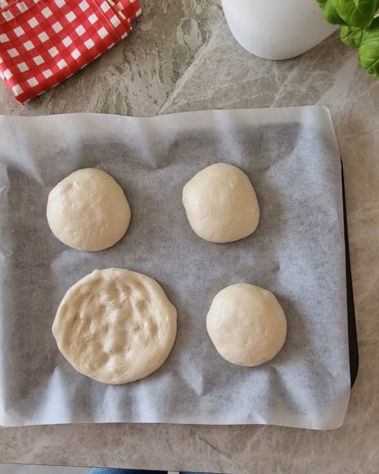 Después del tiempo de reposo, sacad porciones de masa de unos 130g cada una, dejad que fermenten durante 30 minutos, bien cubiertas y separadas entre sí.
