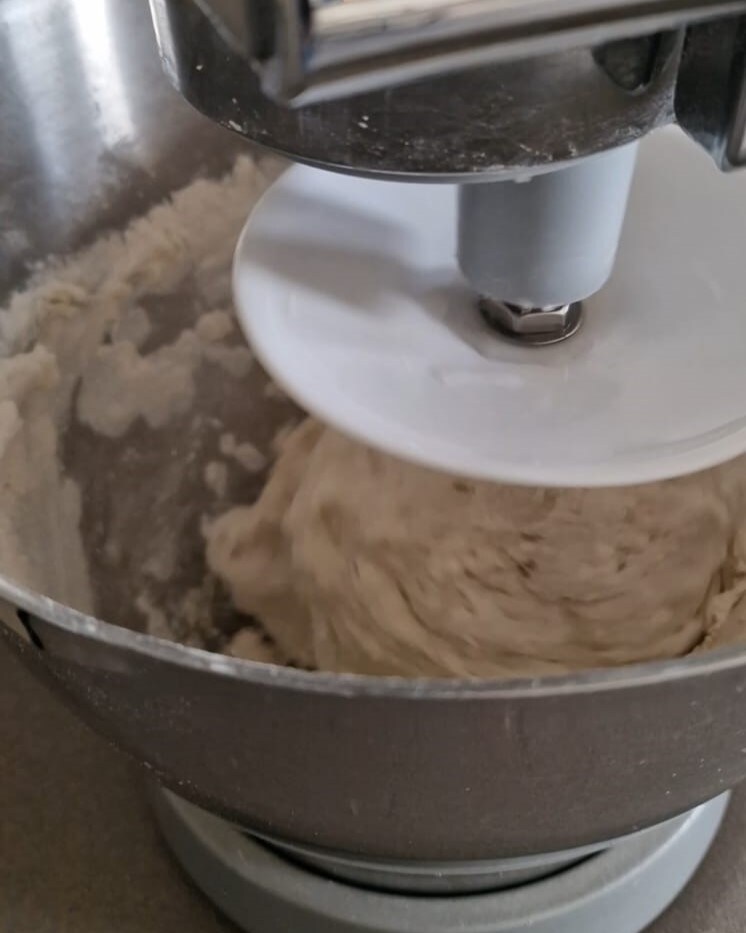 Verted la harina y la levadura en la amasadora, después verted el agua y la sal; poned en marcha el gancho amasador a una velocidad media.