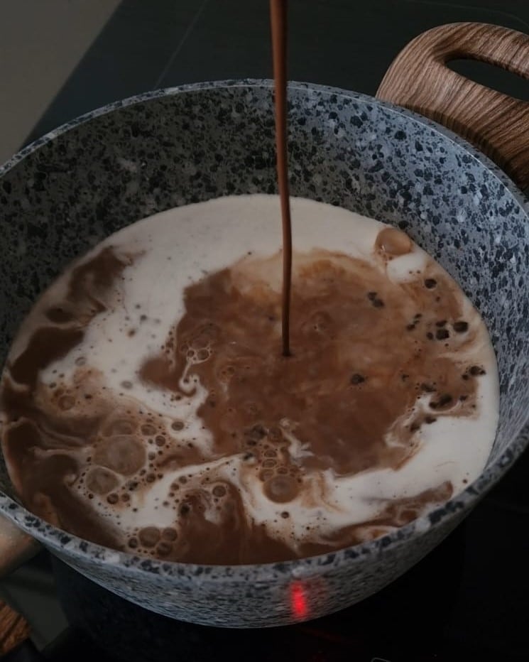 Unid la mezcla a la leche caliente en la olla, y cocinad a fuego lento hasta que espese (tardará unos 4-5 minutos).