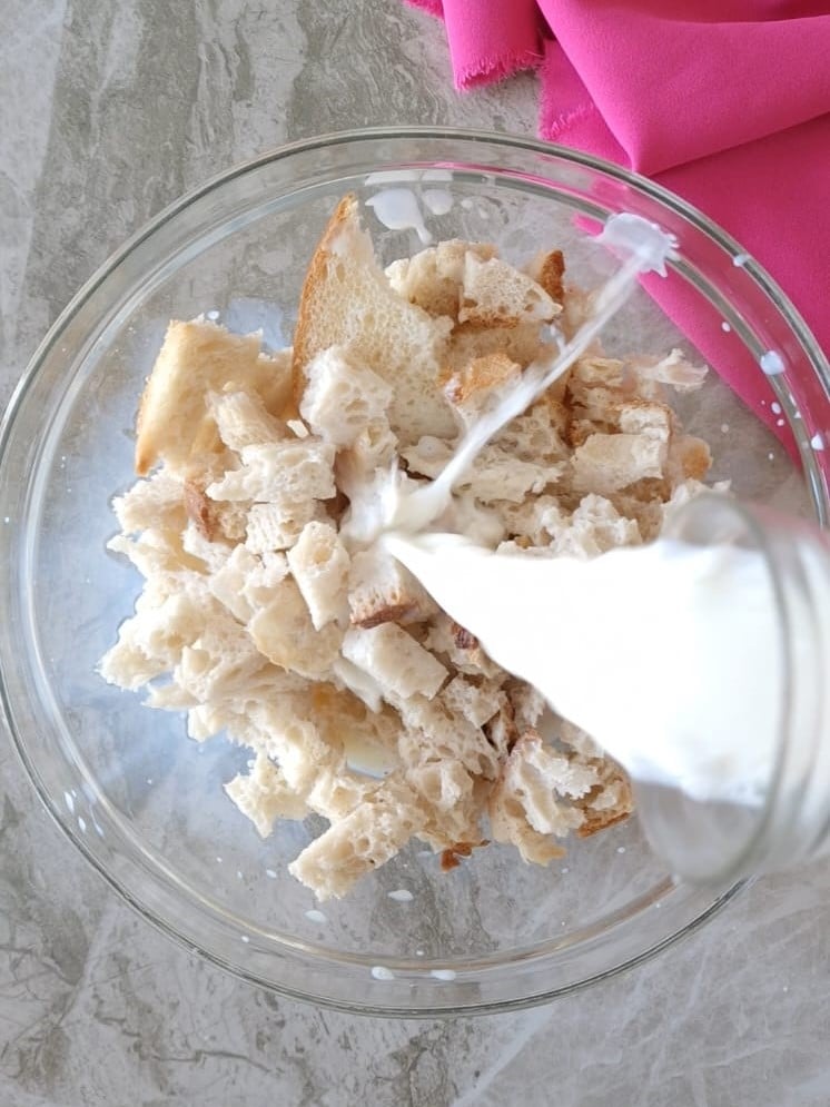Mientras tanto, en un bol sumerge en leche el pan cortado en trozos,
