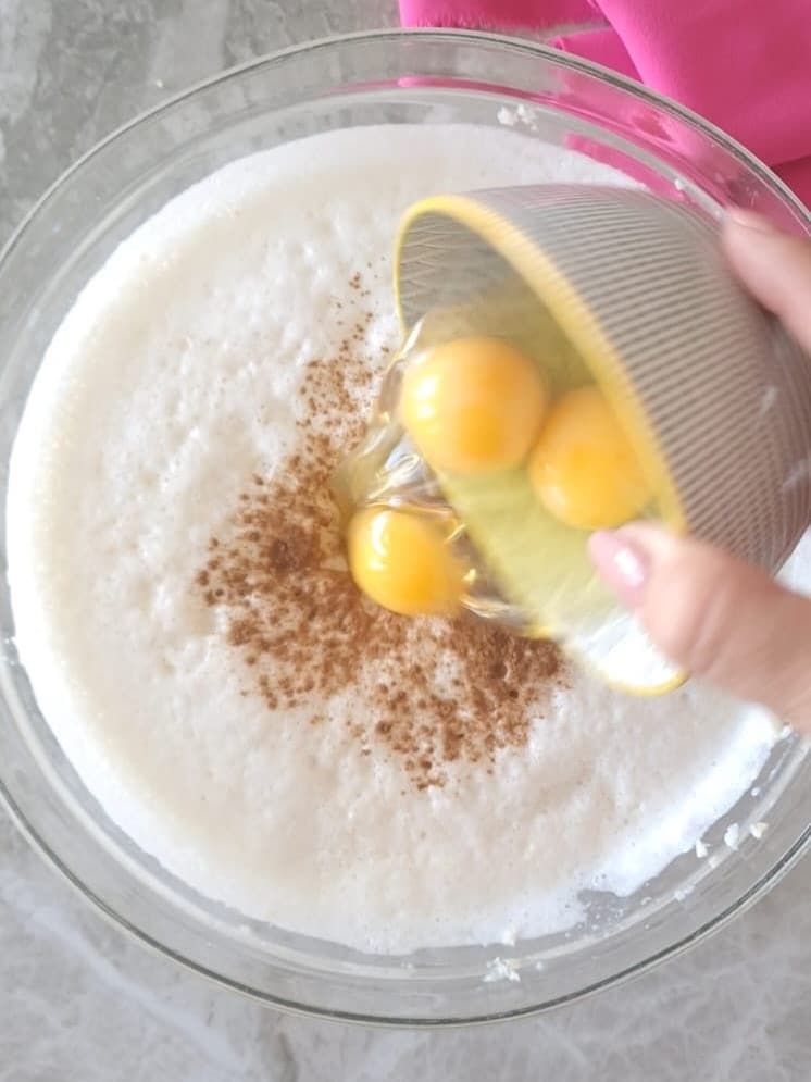 Después tritúralo y añade el resto de los ingredientes: huevos, azúcar, canela. Vierte la mezcla en el molde de corona de 26 cm.