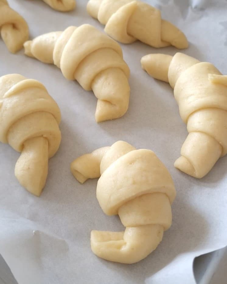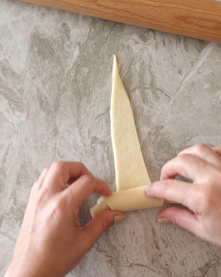 En este punto, con un cuchillo de hoja lisa, haga triángulos regulares, que luego se enrollarán para formar los croissants.