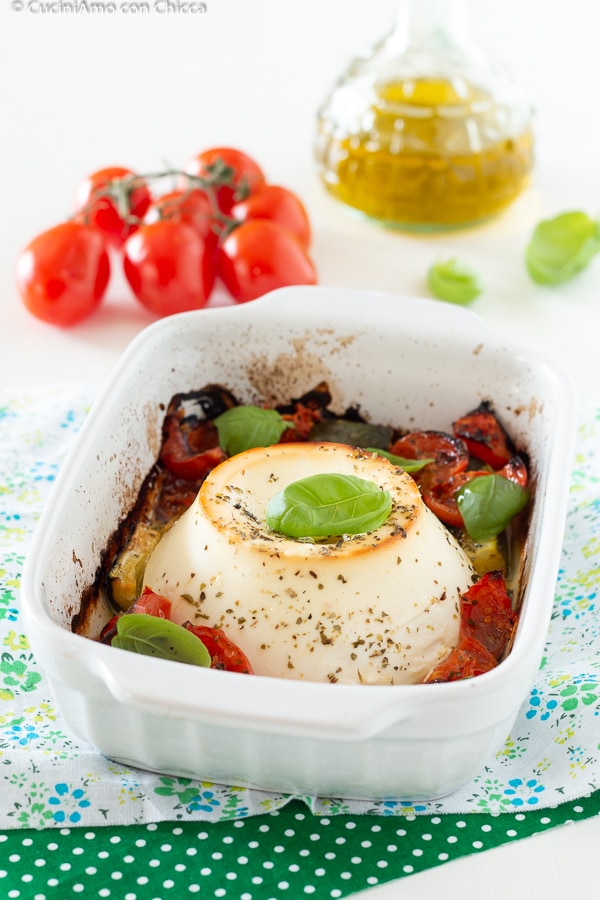 Buenos días queridos amigos, vuestra Chicca está siempre a la búsqueda de recetas sabrosas, fáciles y económicas. Hoy os propongo la RICOTTA AL HORNO CON CALABACINES Y TOMATITOS.