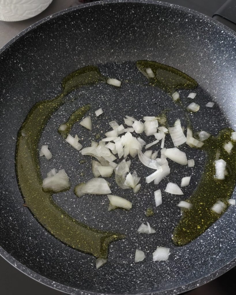 Comienza poniendo los champiñones en remojo, y resérvalos; Después en una sartén grande vierte el aceite y la cebolla picada.