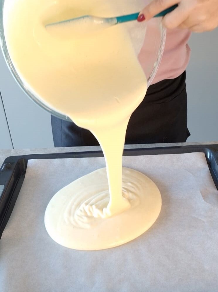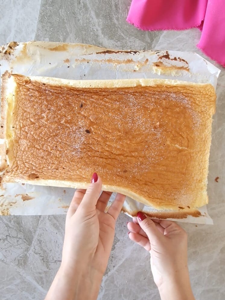 Transcurrido el tiempo de enfriamiento del bizcocho, recorta ligeramente los bordes y luego rellena el bizcocho con la crema preparada anteriormente.