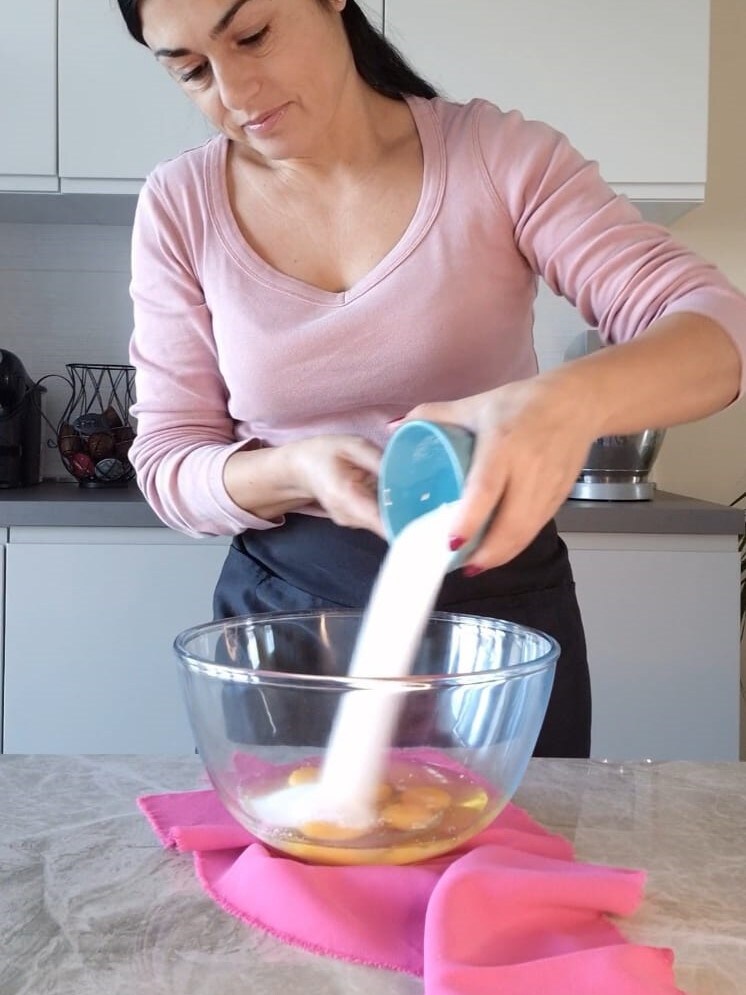 Vierte en un bol los huevos, el azúcar y el extracto de vainilla, empieza a batir, debes obtener una mezcla bien esponjosa y aireada. Te tomará unos 10 minutos.