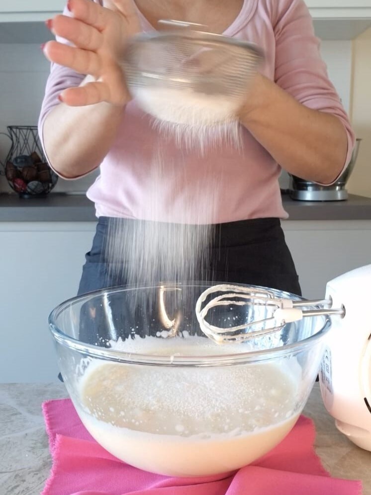 Añade la harina tamizándola directamente en el bol y mezcla suavemente con una espátula de abajo hacia arriba para incorporarla.