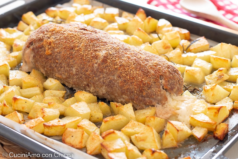 El rollo de carne con champiñones y patatas es un segundo plato completo, fácil y delicioso. Esta receta es una variante de la clásica receta del rollo de carne relleno, esta vez lo he rellenado con champiñones y queso, es ideal para ser servido los domingos en familia o en días festivos como Navidad. La preparación es sencilla, necesitaréis carne picada, huevos y parmesano, se mezcla todo hasta obtener una masa homogénea. Una vez realizada la masa, se rellena con champiñones y quesos fundentes, pero podéis dar rienda suelta a vuestra imaginación según vuestros gustos. Os dejo con la receta ilustrada paso a paso con fotos y vídeo. Por favor, si la probáis, hacédmelo saber en los comentarios. Un beso, Chicca.