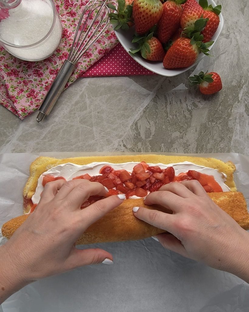 Rollo de nata y fresas, un postre fácil y delicioso, para realizarlo se necesitan algunas precauciones para un resultado sorprendente. Suave bizcocho, con un relleno generoso que te hará enamorarte. ¡Explosión de sabor para una merienda perfecta, prueba también el rollo sacher y el rollo de nata y alchermes o el rollo de pistacho, ¡3 recetas igualmente buenísimas que no te puedes perder! Si en cambio quieres probar una versión más original, puedes sustituir en la receta el bizcocho con bizcocho de cacao. Si te gusta el dulce rollo de nata y fresas, y lo intentas preparar, házmelo saber en los comentarios o en mis páginas sociales de Facebook e Instagram. ¡Un beso, Chicca!