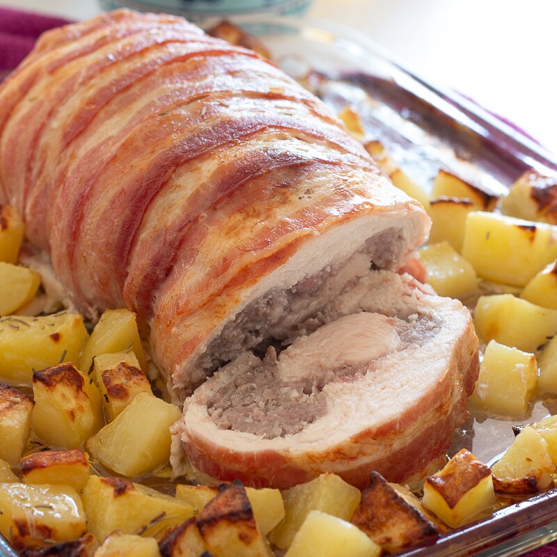 Precalienta el horno a 190°C y hornea el rollo de pollo con patatas durante unos 40 minutos en modo estático. A mitad de cocción, rocía el rollo con vino blanco.
