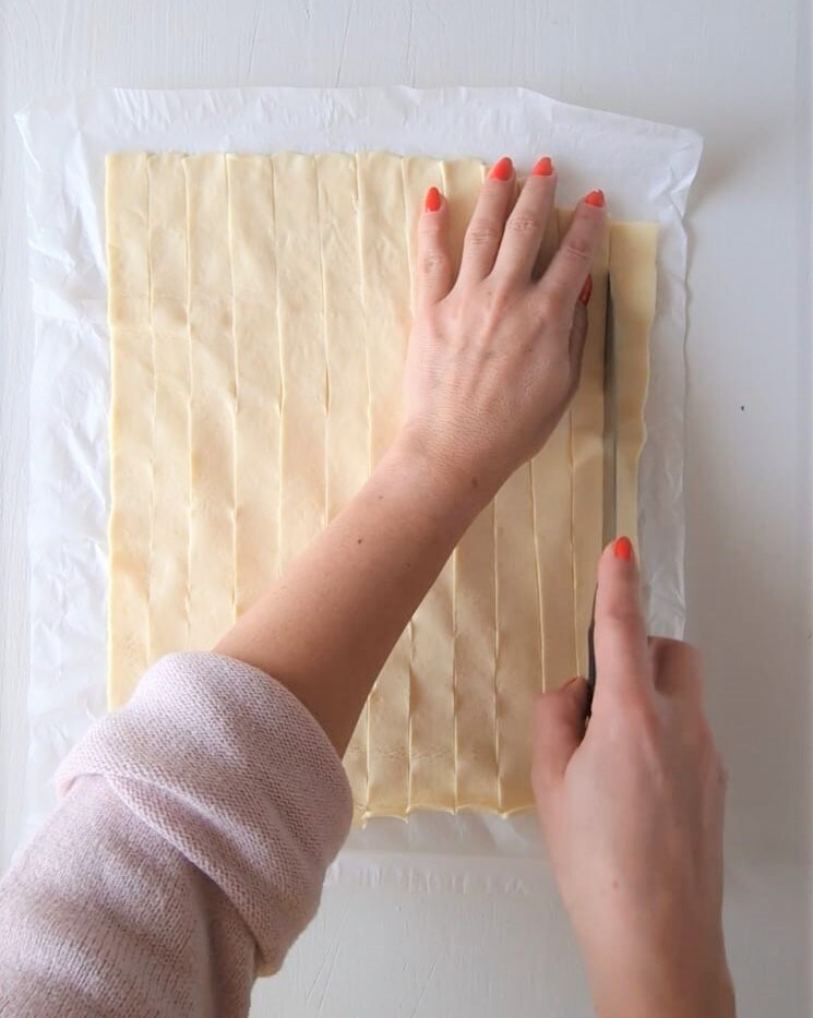 Comenzad desenrollando la masa de hojaldre, luego cortad tiras de aproximadamente 3 cm de ancho y reservad.