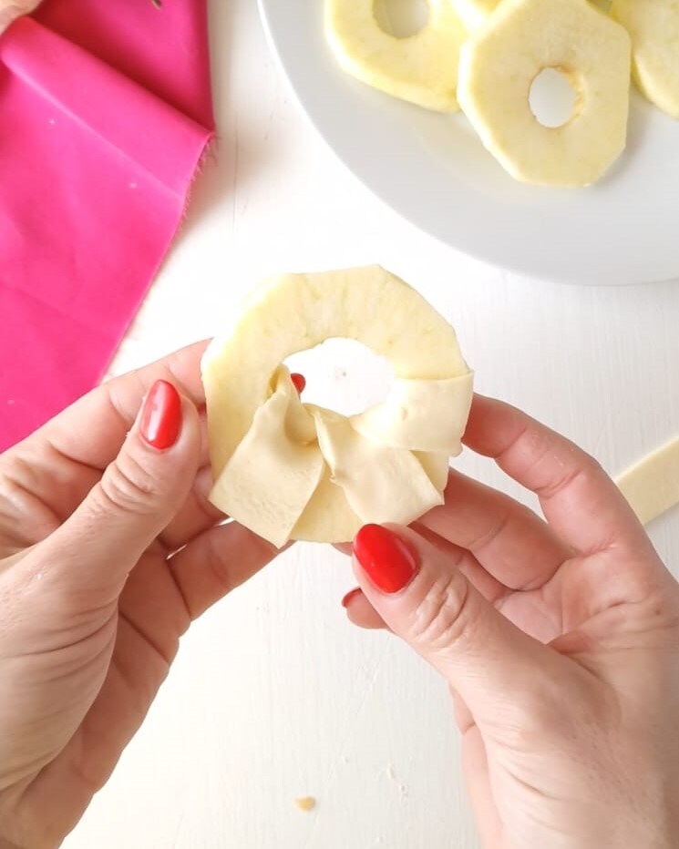 A continuación, cortad en rodajas y luego envolved una tira alrededor de la rodaja de manzana, como veis en la foto.