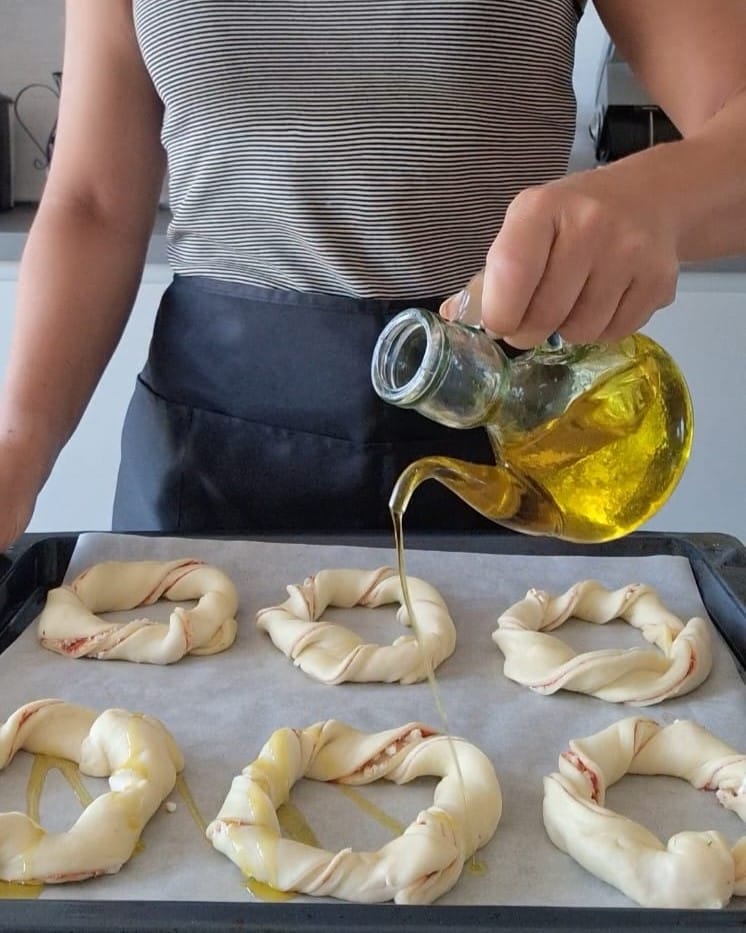 Como último paso antes de hornear, forma rosquillas con las tiras enrolladas; colócalas en una bandeja cubierta con papel de horno y rocía con un poco de aceite.