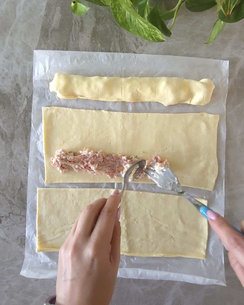 Desenrollad la masa de hojaldre y divididla en al menos tres partes, después rellenadla como si fueras a formar salchichas.