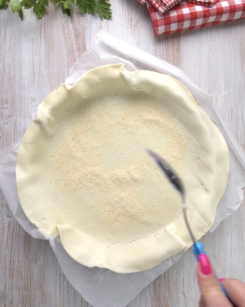 Desenrolla la masa de hojaldre y espolvoréala con pan rallado.