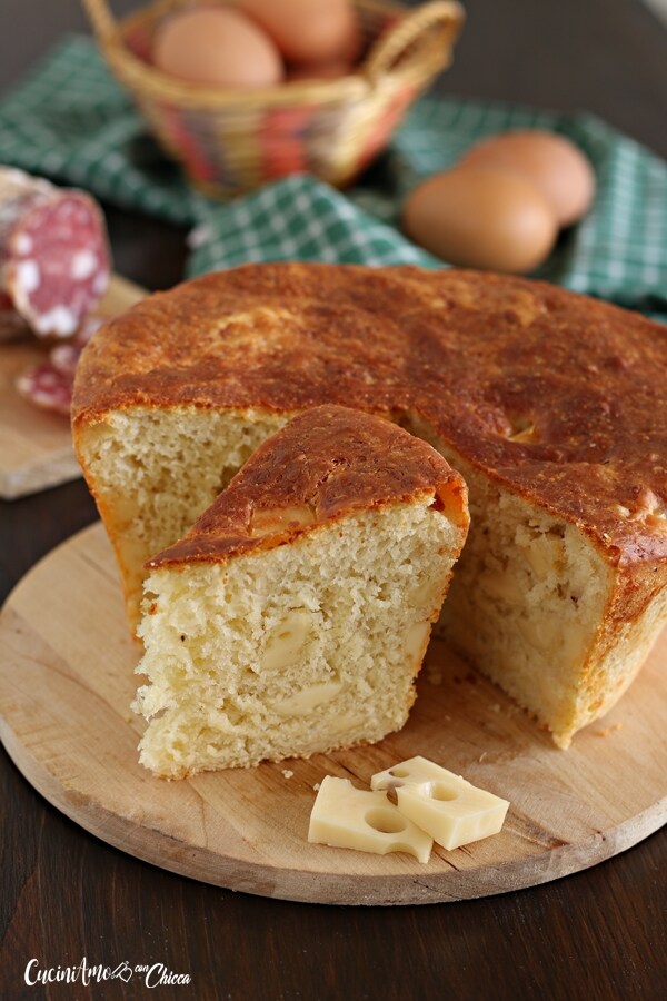 Pasado el tiempo de reposo, añade el Emmental cortado en cubitos, amasa ligeramente con las manos o una espátula, luego vierte la masa en un molde engrasado especial para tartas de 15 cm de la típica forma cónica.