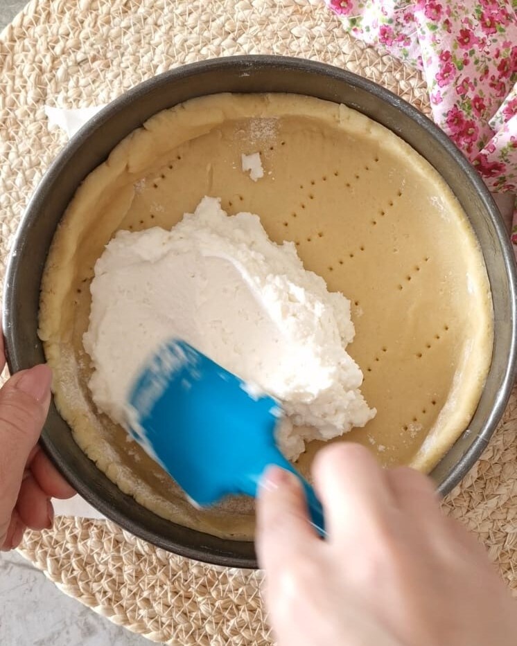 Pasado el tiempo de reposo, toma los bloques y extiende con el rodillo dos hojas, luego con la primera masa extendida, cubre un molde de 22 cm y rellena con la mitad de la crema de ricotta.
