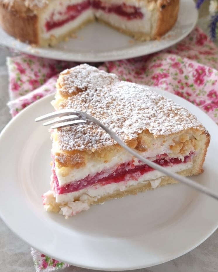 Tarta de ricotta y alchermes, un postre increíble, cremoso y facilísimo de hacer! Compuesto por una base de masa quebrada de mantequilla crujiente y perfumada que no se rompe, se rellena con ricotta y bizcochos empapados en alchermes. Para la receta me inspiré en la tarta con ricotta y guindas, buenísima, también está la versión de la tarta de cacao con ricotta y trocitos de chocolate. La Tarta de ricotta savoiardi y alchermes es un postre para servir al final de la comida, dada su cremosidad se conserva por varios días.
