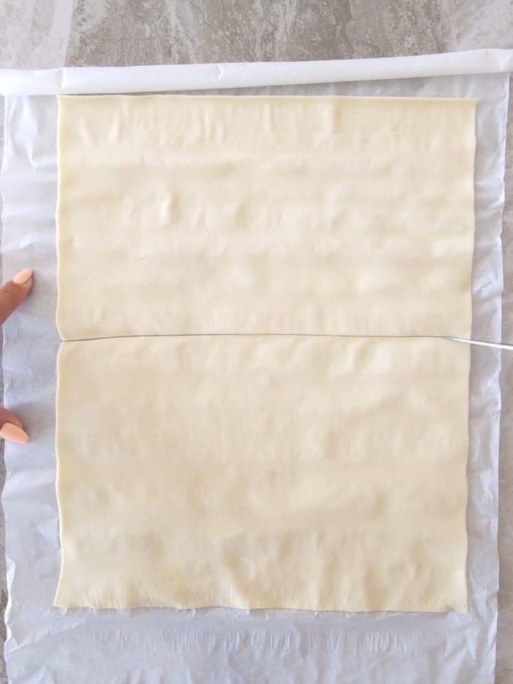 Comienza desenrollando el hojaldre, luego divídelo en dos por la mitad de su lado largo.
