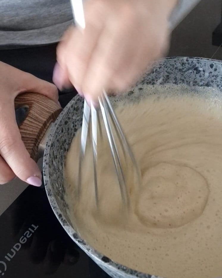 Añadid la harina y luego la leche caliente, después transferid al fuego.