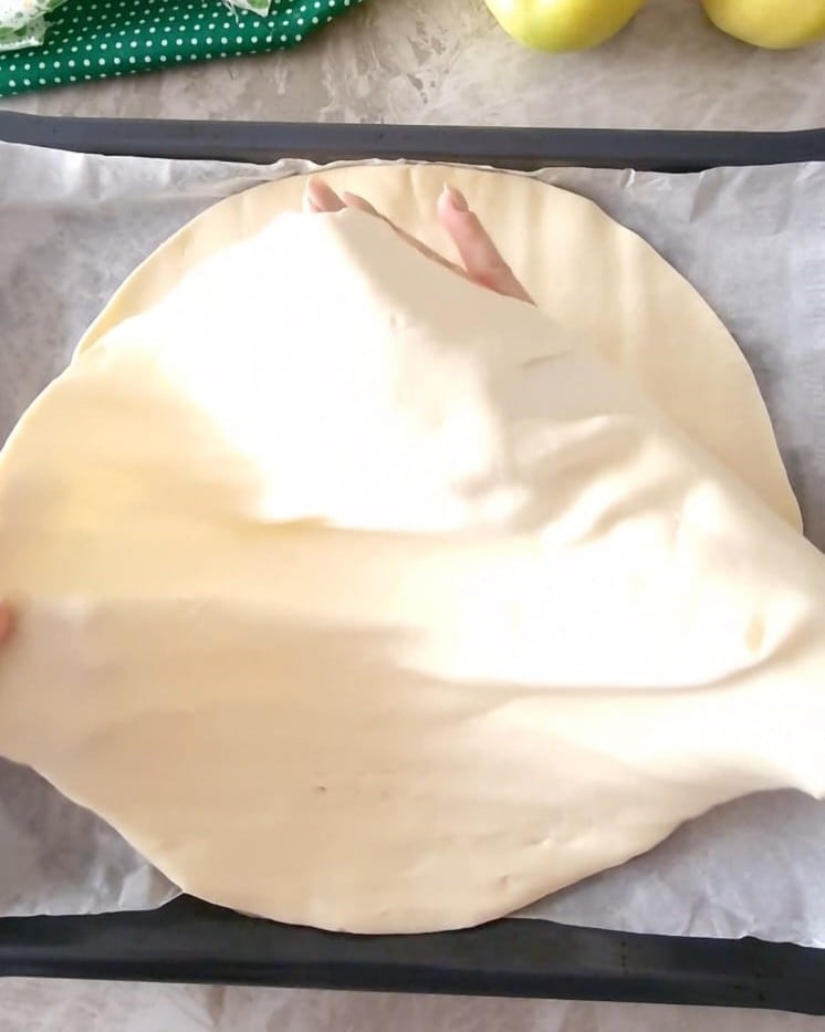 Extiende la masa de hojaldre con su papel sobre una bandeja de horno y coloca otra encima, enrolla los bordes formando un reborde, luego pínchala con los dientes de un tenedor.