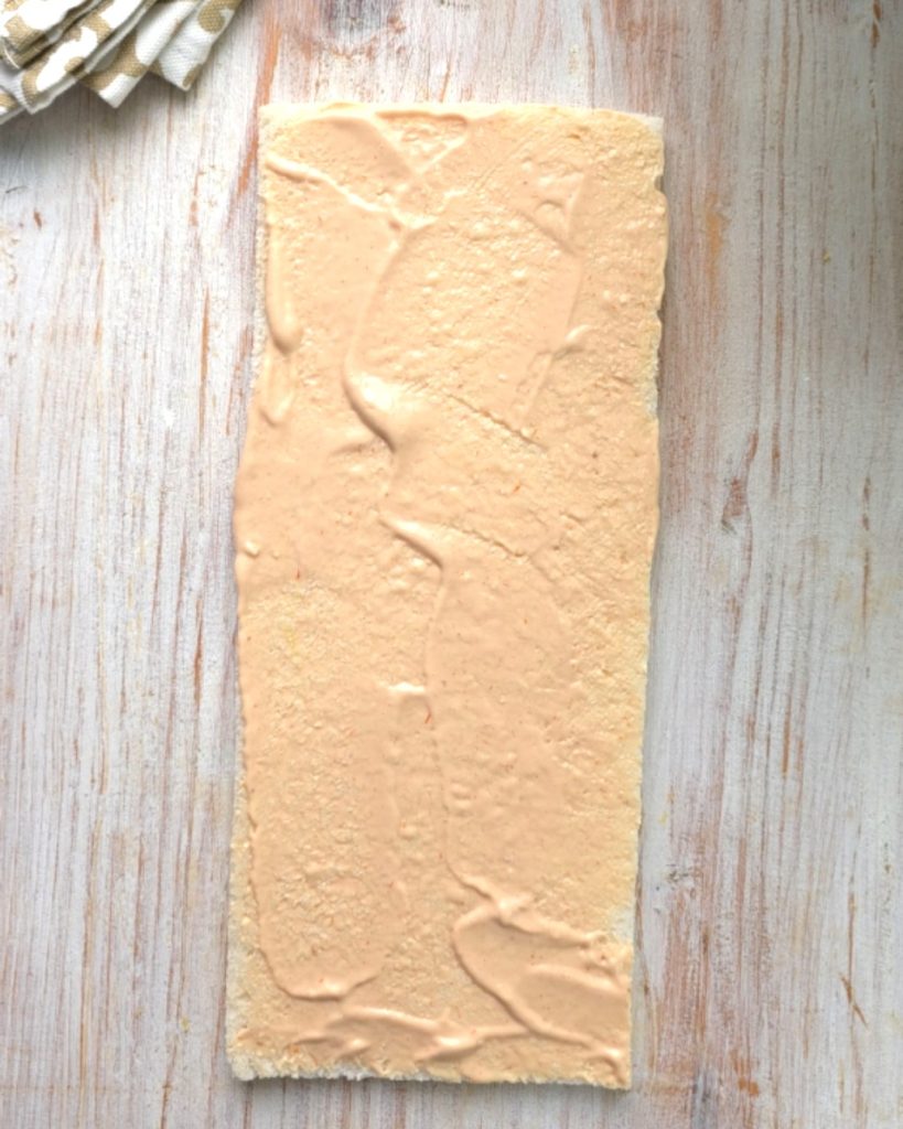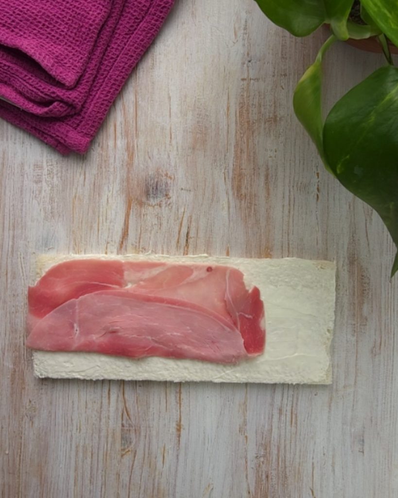 Para el segundo relleno, toma una rebanada de pan de sándwich y úntala con queso para untar y jamón cocido.