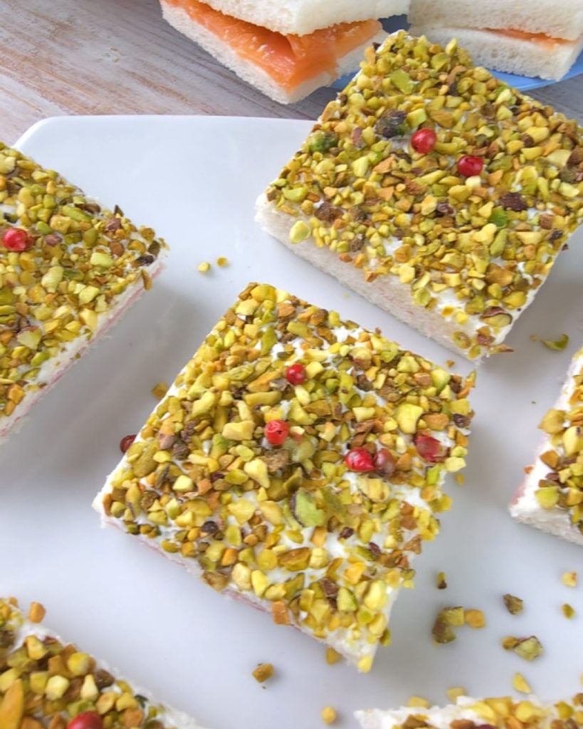 Cubre con otra rebanada y en la superficie unta más queso, luego decora con pistachos picados y algunos granos de pimienta.