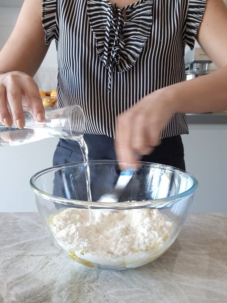 En un bol grande, poned la harina, verted el aceite, la sal y el agua poco a poco.