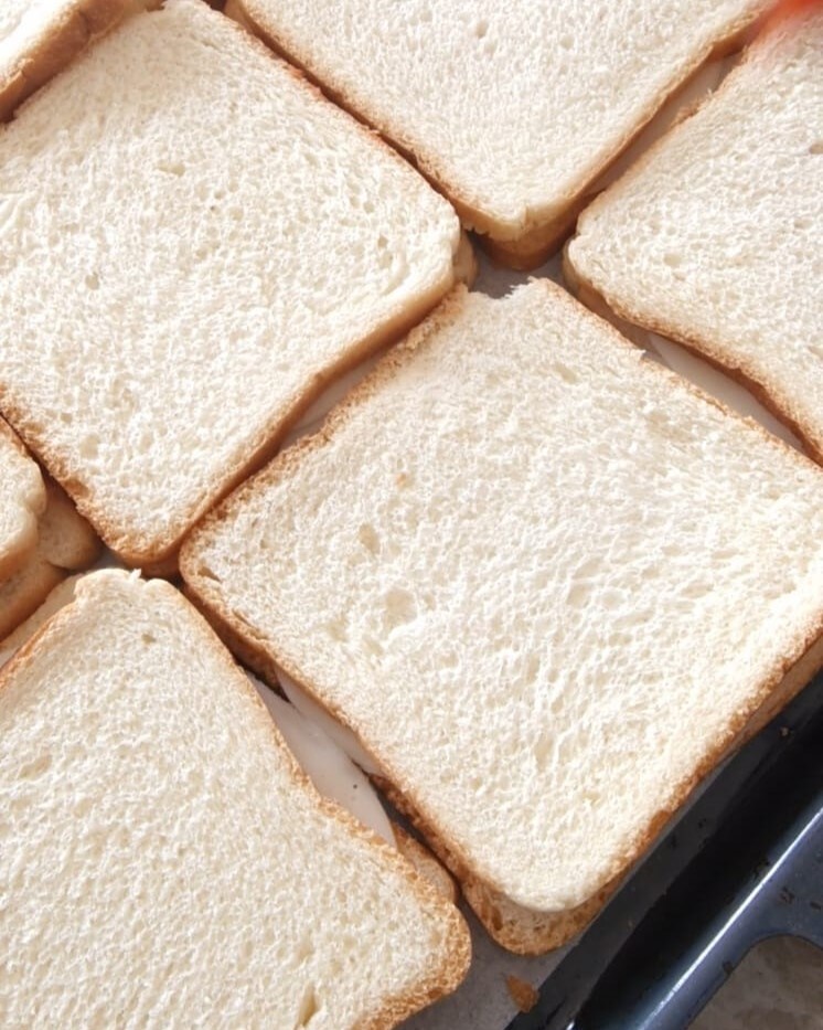 Cubre una bandeja rectangular con papel de hornear, luego coloca las rebanadas de pan de molde una al lado de la otra.