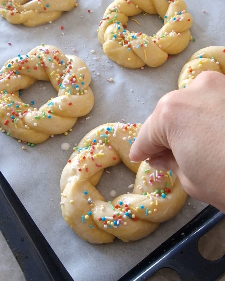 Como último paso, batid un huevo junto con un poco de leche y pincelad la superficie de las trencitas de Pascua, seguidamente esparcid los nidos con el granillo de colores.