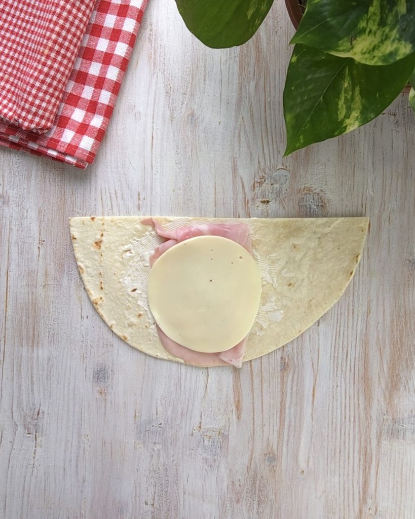 • Rellénala con queso untable, luego coloca en el centro una rebanada de jamón cocido y una rebanada de queso scamorza.