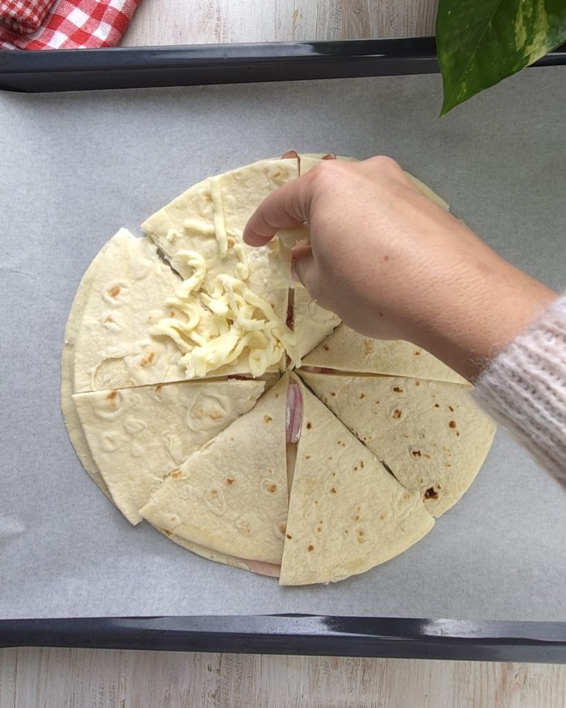 • Coloca todos los triángulos de piadina rellena en una bandeja cubierta con papel de horno uno al lado del otro y completa con la mozzarella rallada. Hornea en el horno precalentado a 200°C hasta que el queso se haya derretido completamente, aproximadamente 10 minutos.