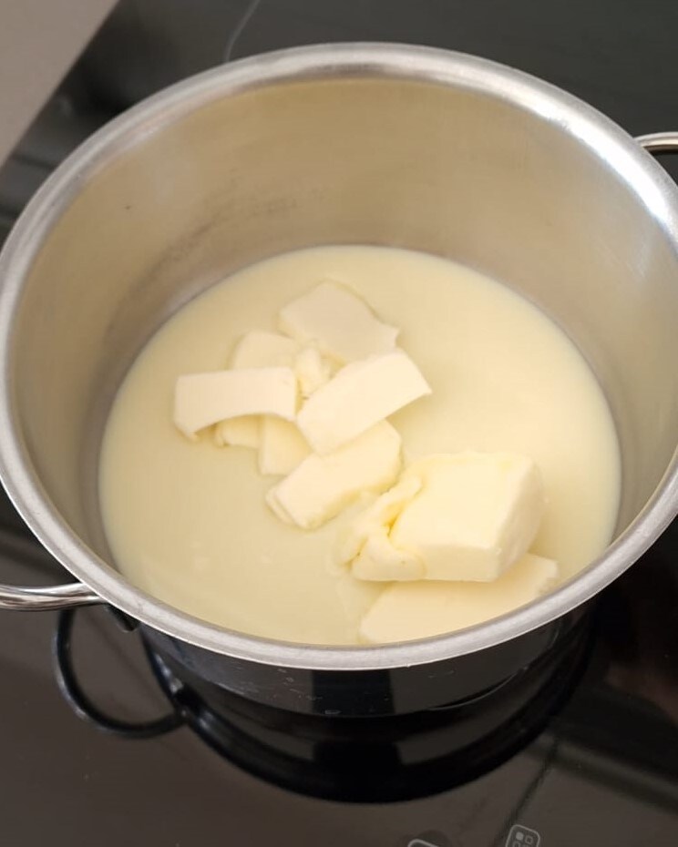 En una cacerola de acero, pongan la leche condensada y la mantequilla.