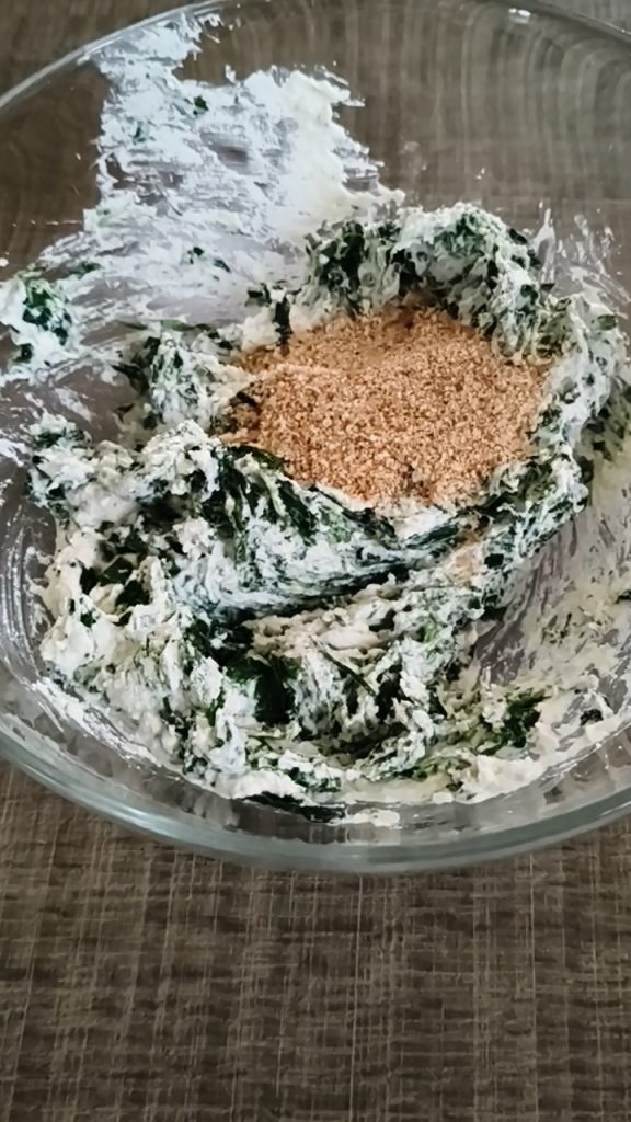 Añadir la ricotta y todos los demás ingredientes, excepto el aceite. Mezclar bien todo y valorar si hace falta otra cucharada de pan rallado.