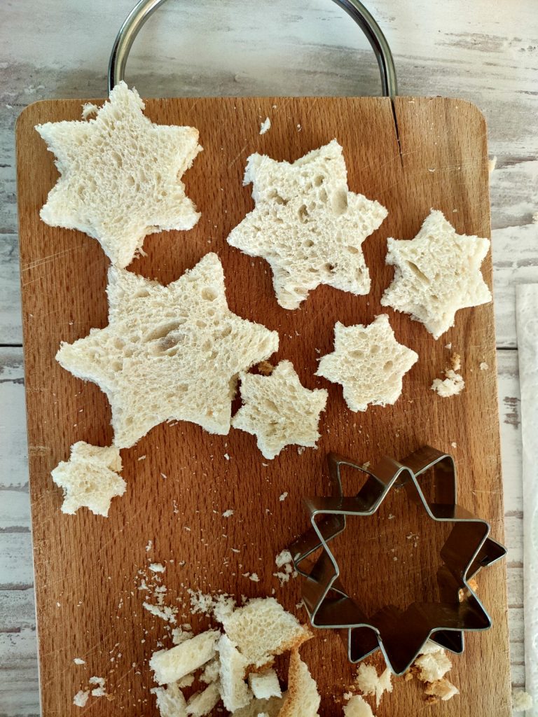 – Quitar la corteza de las rebanadas de pan de molde y cortarlas con las formas de estrella de varios tamaños.