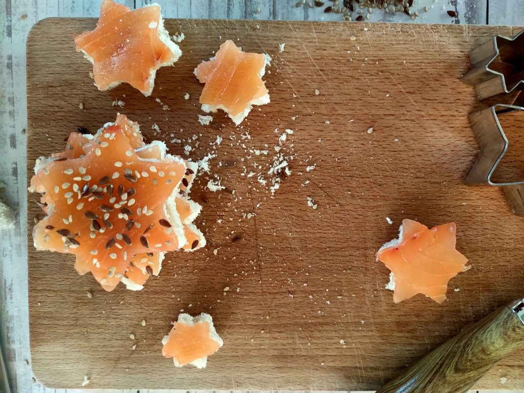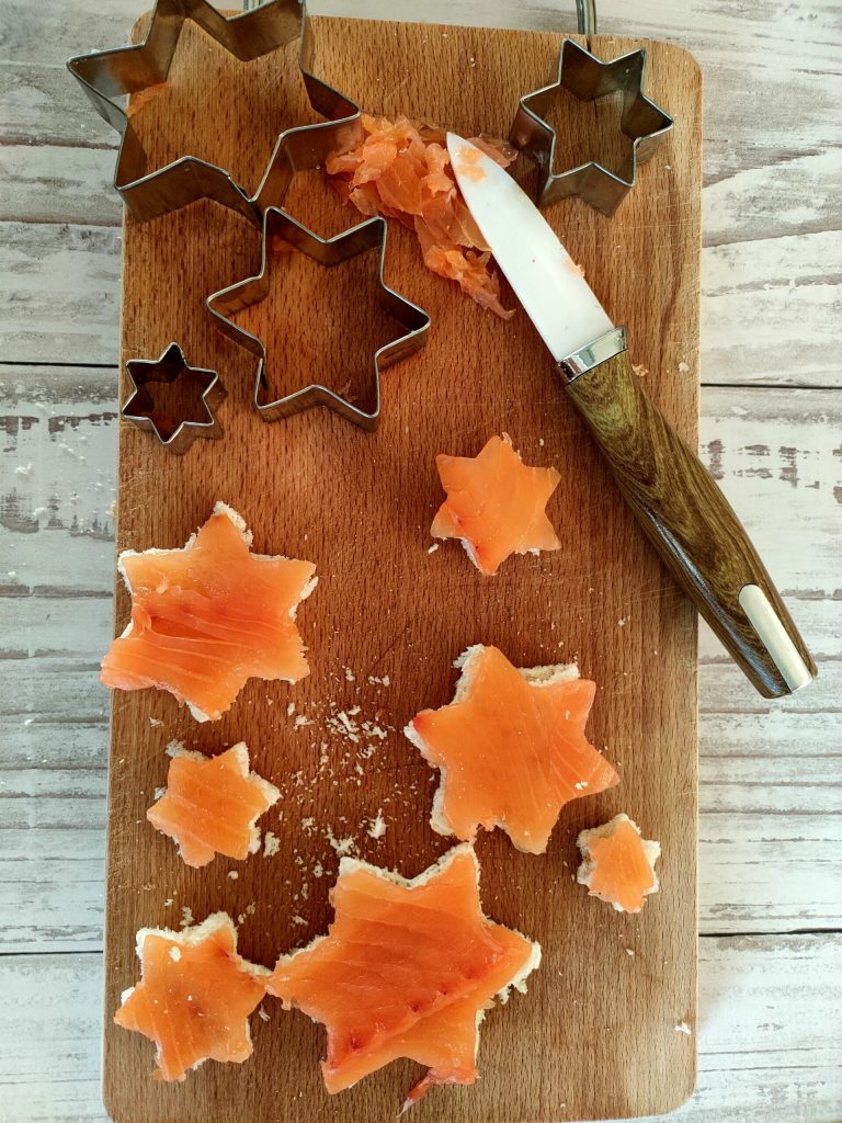 – Cortar el salmón, haciendo un poco de presión para obtener un corte limpio y luego superponer a las estrellas de pan correspondientes.