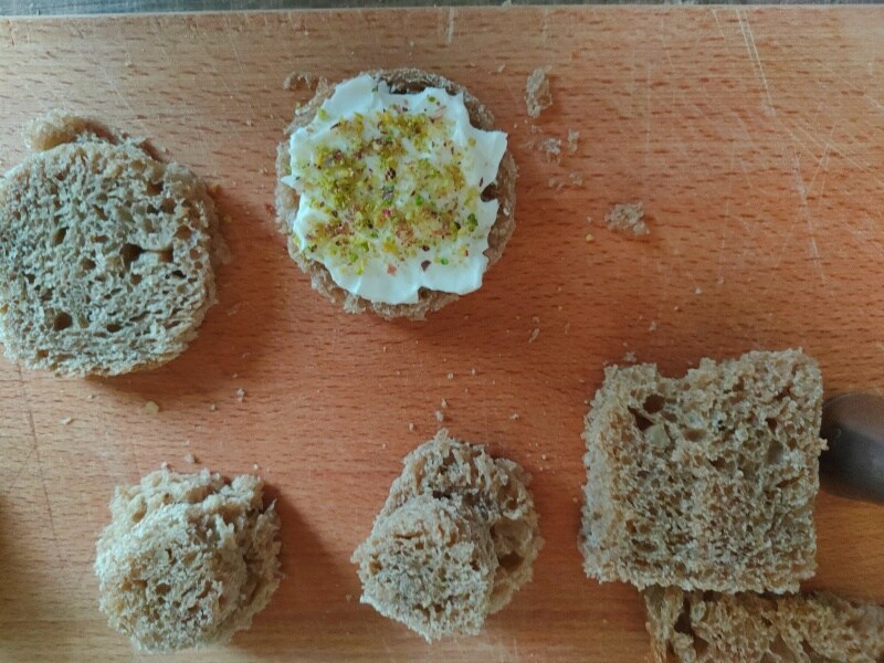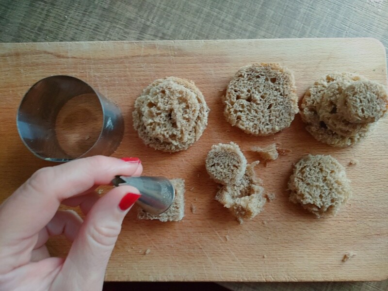 • – Quitar la corteza a las rebanadas de pan y formar los discos con cortapastas de varios tamaños.