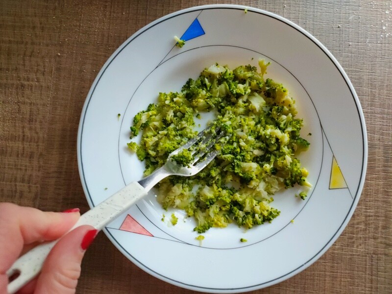 • – Cocer las cimas de brócoli en agua con sal, luego escurrirlas y aplastarlas con un tenedor.