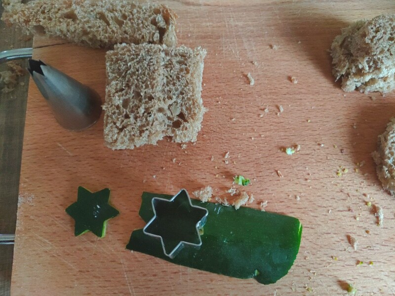 • – Cortar de un calabacín una tira de piel y de esta, con una formita pequeña, cortar las estrellitas.