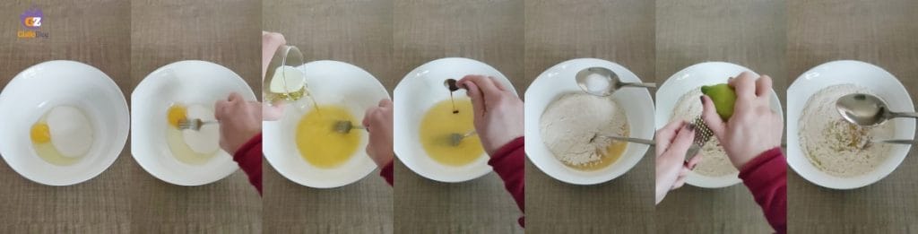 – Poner en el bol el huevo con el azúcar y batir con un tenedor; agregar el aceite, la vainilla, la harina tamizada, el amoníaco, la ralladura de limón y el ron; formar una masa compacta (si es necesario añadir una cucharada de agua).