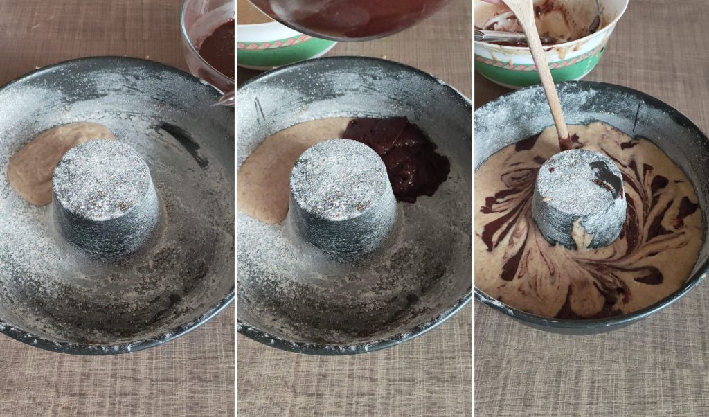 – Alternar las dos mezclas en el molde, luego con el mango de la espátula formar remolinos.