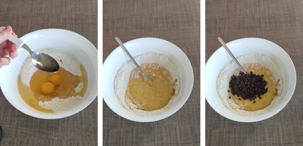 – Añadir también una cucharada de ron, amasar brevemente y luego incorporar los trocitos de chocolate