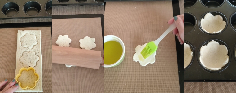 – Con un cortador en forma de flor, o redondo, cortar las rebanadas de pan para sándwiches, aplastarlas ligeramente con el rodillo y pincelarlas con una mezcla de agua y aceite (también podéis humedecer con solo agua).