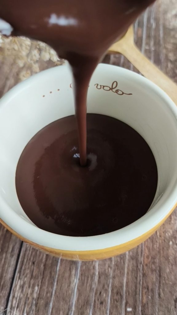 Apagar el fuego y verter la crema caliente de chocolate para el desayuno en las tazas.