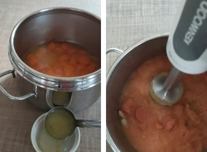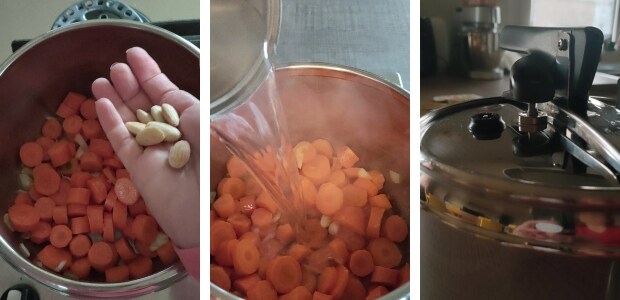 – Añadir un puñado de almendras sin piel y verter el agua hirviendo (salada y con las almendras). Cerrar con la tapa la olla y llevar a presión calculando 6′ desde el silbido.