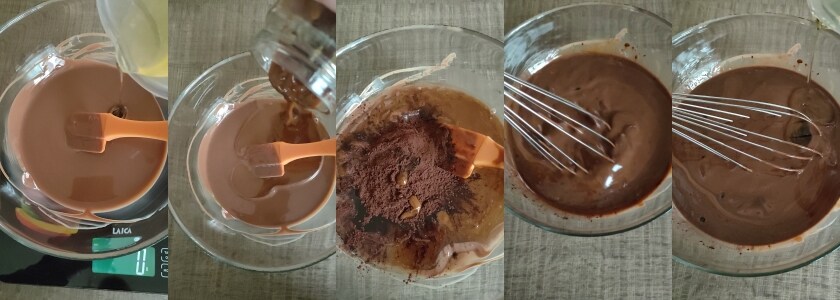– Pasar a un bol el chocolate con leche derretido en el microondas y 30 g de aceite de arroz, añadir la pasta de avellanas, la vainilla y el cacao amargo tamizado, mezclar con la batidora de mano para eliminar los grumos.